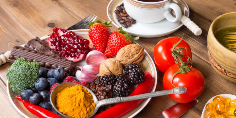 Φρούτα: Γκρέιπ φρούτ, βατόμουρα, πορτοκάλι, μύρτιλλα, ρόδι, κεράσια, ακτινίδια, μήλα, δαμάσκηνα, μπανάνα, αχλάδι, κόκκινα μούρα, σμέουρα, βερίκοκα κ.α Όλα τα εσπεριδοειδή αποτελούν άριστη πηγή βιταμίνης C που αποτελεί μια από τις πιο σημαντικές αντιοξειδωτικές ουσίες